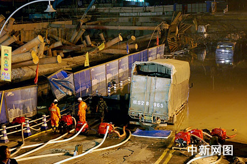 杭州消防支隊立即通知自來水公司對周圍市政水源和其他污水管道進行關閥斷流;對事故現場比鄰已嚴重滲水的河流進行加固攔堵。同時,先后調集20臺手抬泵,在坍塌區域周邊搭建抽水平臺進行作業;另調集15臺潛水泵、6臺泥漿泵實施高密度不間斷抽水作業。