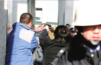 數名男子圍攻京華時報攝影記者夏永(被揪者)。新京報記者孫純霞攝