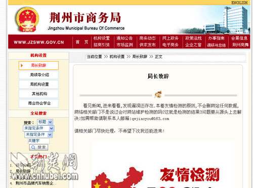 湖北荊州商務局網站再被黑 黑客留言稱友情檢測