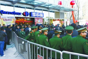 “新店開張,油、米、面、肉低價促銷,還發券,能不吸引人嗎?”李先生說,昨日上午9時許,他原準備趕在超市剛開門就進去轉轉。但一到萬達廣場,只見家樂福門口聚集著大量顧客,數百人的隊伍早就排至數十米外,并還在不斷膨脹。為維持秩序,工作人員在隊伍兩側安置了簡易護欄,同時,數十名武警一字站開,引導眾人進入超市。