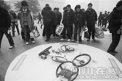 昨(11)日上午,成都交警二分局民警在火車(chē)北站廣場(chǎng)設(shè)立“春運(yùn)交通安全宣傳點(diǎn)”,將“酒后駕駛”“超速”等嚴(yán)重交通違法行為以行為藝術(shù)的形式警示市民。
