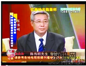 在一家電視臺播出的億康納米能量杯廣告中,一位學者打扮的人端坐當中,文字顯示,“專家”名叫陳偉明,是中國醫促健康飲水協會理事。而在另一幅華佗延壽酒的廣告視頻截圖中,容貌一樣,甚至連領帶圖案都一樣的“陳偉明”,“搖身一變”卻成了“關新良”,身份也變成《北京中醫》雜志編委、中國中西醫結合協會理事、北京中日友好醫院主任醫師。