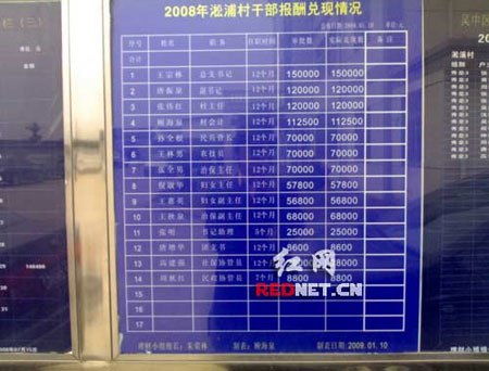 “一個村官年薪15萬,嚇得俺一跳!”16日中午,網友“湘水悠悠”在紅網論壇發帖,稱在搜狐新聞社區、天涯社區等網絡社區看網友貼出的蘇州市吳中區甪直鎮淞浦村村務公開的一張照片,內容為2008年該村“村干部報酬兌現情況”,村支書年薪15萬,村主任12萬,月薪過萬。有網友感慨說,“這收入可比公務員強多了”。
