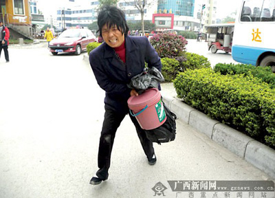2月25日下午,在靈川縣商貿城門口,一名男子推著一具包裹得嚴嚴實實的“尸體”在討錢。當記者提出要幫他找有關部門解決困難時,男子急忙“收攤”,拖著“尸體”離開。記者跟著他們,只見那具“尸體”忽然爬起來,抱著滿滿一桶討來的錢邁著矯健的步伐逃開。