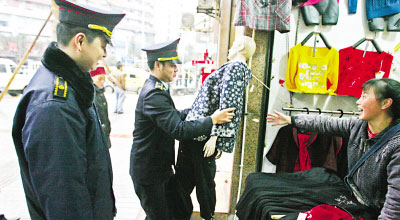 記者在沙坪壩區天陳路看到,臨街的公苑旅館在窗外懸掛被單,3名城管隊員連忙趕去,幫助店主收拾被單,臨走時丟下一句溫馨提醒“請記住,以后不要隨意懸掛物品”,整個過程只用了5分鐘,并未開罰單,店主十分滿意。10:10,記者看到,石碾盤一家服裝店剛購進2個模特兒,女店主一人無法搬移,2 名城管隊員連忙上去幫忙。10:20,天陳路一個“傳統包”店前,2名城管隊員正熱情幫助店主搬蒸鍋。旁邊的“泰國香米蛋糕”店門前,也有城管隊員在幫忙。