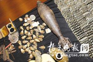 為什么如此熱衷于征集侵華日軍遺物?聽了張廣勝的自述,記者才知道原來他的外公就是在抗日戰爭中被日軍將雙眼弄瞎的。“小的時候我常聽身邊的老人們講故事,講到日本侵略者的暴行,在我心里留下了深深的烙印。后來工作了,有一次下鄉,我還記得那是1998年,偶然在一個山村里見到一個放羊人,他將頭羊拴在地上吃草,而我驚訝地發現,他用來拴頭羊的那根鐵桿竟然是日本二戰時最常用的三棱式刺刀。這使我一下子想起許多童年聽到的故事,我覺得有必要把這個刺刀帶回去給大家看看,從這開始我經常利用業余時間上山下鄉,去尋找當年日軍在東三省留下的遺物。”