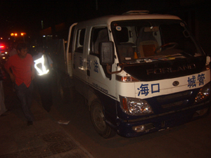昨日,海口交警支隊事故處理大隊的陳警官說,“車上印有‘行政執法’字樣,且是1.25小型卡車。根據目擊市民的反映,我們連夜對?诔枪懿块T的行政執法車輛進行排查。”
