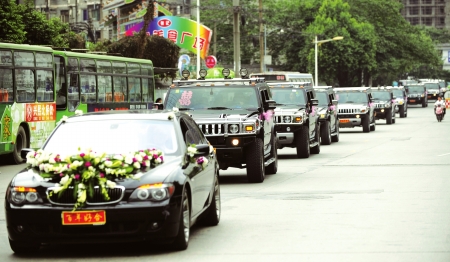 新郎朱先生告訴記者,他與新娘賈小姐屬于一見鐘情,相戀一年多才結婚,用悍馬車當婚車的創意來自朋友!俺藢汃R7系是我的,悍馬車全是朋友們的。”朱先生說,在婚禮前一個月,他開始四處找朋友借車,婚禮前一周汽車全部集結到位。