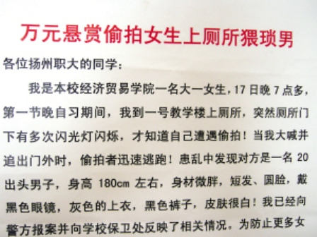 18日,一張張名為《萬元懸賞偷拍女生上廁所的猥瑣男》的“懸賞啟事”,張貼在了揚(yáng)州職業(yè)大學(xué)校園內(nèi),吸引了該校師生的注意。記者看到,“懸賞啟事”標(biāo)題的字體和顏色都格外醒目,內(nèi)容為一位大一女生遭遇偷拍的經(jīng)歷。“我是本校經(jīng)濟(jì)貿(mào)易學(xué)院一名大一女生,17日晚7點(diǎn)多,第一節(jié)晚自習(xí)期間,我到一號(hào)教學(xué)樓上廁所,突然廁所門下有多次閃光燈閃爍,才知道自己遭遇偷拍!……我已經(jīng)向警方報(bào)案并向?qū)W校保衛(wèi)處反映了相關(guān)情況。為防止更多女生受侵害,早日將這種性變態(tài)的人繩之以法,我個(gè)人出10000元懸賞知情人提供有價(jià)值線索。”記者注意到,“10000元”的字體很大,而且是紅顏色,格外惹眼。啟事最后還寫著“捍衛(wèi)女生權(quán)益,和偷拍斗爭(zhēng)到底”的字樣。
