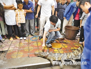 昨下午,綦江縣橋河社區陽光幼兒園旁的人行道。一條一米六七的鱷魚被兩小伙合力抓尾巴拖出鐵籠,一把鐵鉗夾住鱷魚頸,鐵錘敲頭、尖刀割喉……就這樣,本性兇殘的鱷魚在五六十人圍觀下,被殺死肢解,嚇得不少小朋友蒙眼,膽小的成人失聲尖叫。