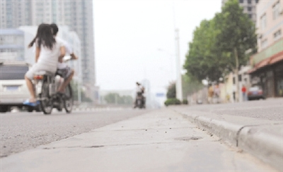 隨后,記者再次趕往事故地點,發現“兇手”是快車道和人行道之間的銜接部分。乍一看和其他剛修的路段一樣,并不能看出這條路有啥異樣,俯身細看,才找到“癥結”:快車道和人行道長約20米的交界處,臺階高出快車道約2厘米。
