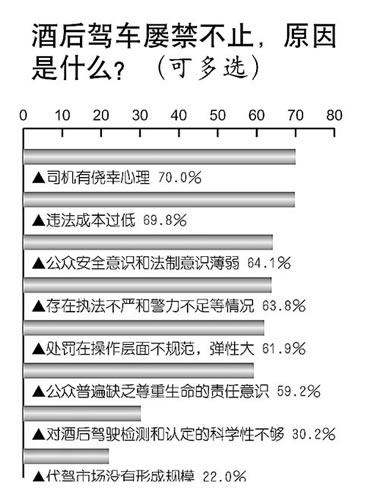 酒后駕車現象屢禁不止,原因是什么?調查中,70.0%的人首選“司機有僥幸心理”,69.8%的人認為是“違法成本過低”,64.1%的人表示“公眾安全意識和法制意識薄弱”,59.2%的人表示“公眾普遍缺乏尊重生命的責任意識”,22.0%的人選擇了“代駕市場沒有形成規模”。