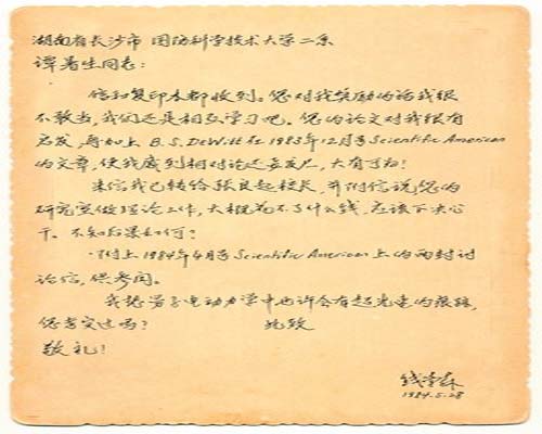 就這樣,在錢學森的鼓舞下,譚暑生多年來一直矢志于理論研究工作,并且不斷取得新的突破。后來錢學森的身體狀況沒以前好了,他才停止給譚暑生親筆回信。譚暑生已習慣了給錢學森寫信匯報科學研究的新進展。收到譚暑生的信后,錢學森仍會安排秘書打電話回復他,對他所取得的研究成果表示祝賀。