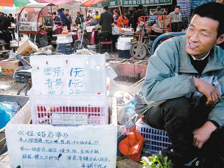 “我的條件一般,找個和我合適、能過日子的就行”,對于心中的另一半,余東陽的想法很本分,“具體的啟事上都寫著呢,您先自己看看”,嘴里說著話,眼睛卻沒閑,和記者聊天時,余東陽看到有人買菜,趕快又做起了生意。周圍賣菜的人告訴記者,余東陽做生意很勤快,也能吃苦,每天早上6點就準時從批發市場把菜運來,還經常幫旁邊的人占攤位,晚上一般不到8點,就能把菜賣完,平均一天收入100元左右。而在與余東陽的聊天中,他告訴記者自己平時看營銷類的書,他相信自己將來還會做更有前途的生意。