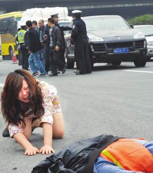 卡宴車頭前10余米的右側(cè)車道上,幾個男女跪在地上,圍成一圈放聲痛哭。