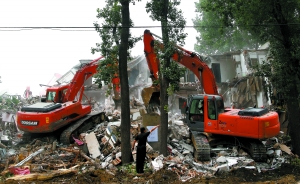 8時30分許,東北角被拉上了警戒線,城管、公安和消防部門進行了拆遷前最后的清場。9時整,7臺挖掘機開始同時向盛佳網絡公寓掘進,不到半小時,3層小樓的外立面已面目全非。同時,東北角的另外幾棟待拆公寓也開始動工,華倫公寓的平房被逐一推倒、金唐公寓變為了一堆瓦礫。