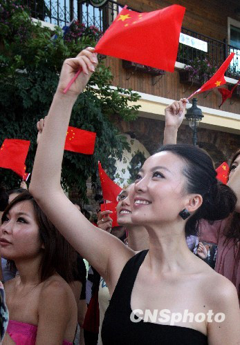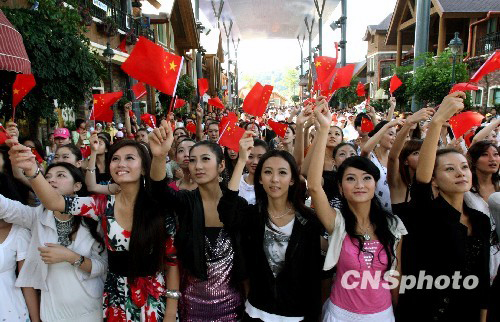 圖:黑龍江大學生揮舞國旗為祖國歡呼
