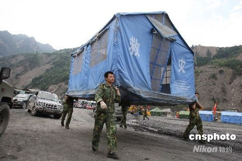 圖:鐵軍官兵搬遷帳篷準備重建新映秀