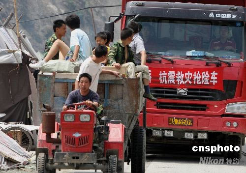 圖:四川震區村民開拖拉機返鄉準備重建家園