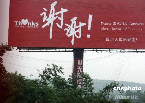 震區宣傳牌多國語言感謝中國和國際社會