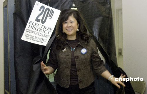 圖為其中之一的華埠第二十選區的司徒仲菁5日在孔子大廈投完一票。她是希拉里競選團隊的紐約亞裔社區顧問。