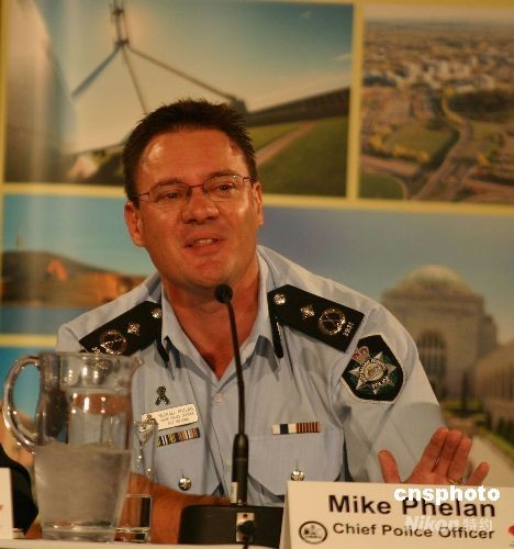 圖為堪培拉警方負責人邁克·菲蘭在23日的新聞發布會上接受記者采訪。