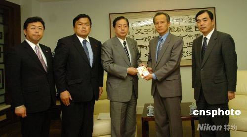 5月13日下午,日本執政黨之一的公明黨黨首太田昭宏來到中國駐日使館向四川地震災區捐贈五十萬日元善款。中國駐日大使崔天凱、公使孔鉉佑代表中國政府接受了公明黨的捐贈。中新社發 朱沿華 攝