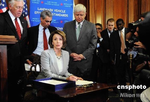 圖為眾議長南希·佩洛西(坐者)在國會其他領袖的陪同下簽署了這個剛剛通過的方案。