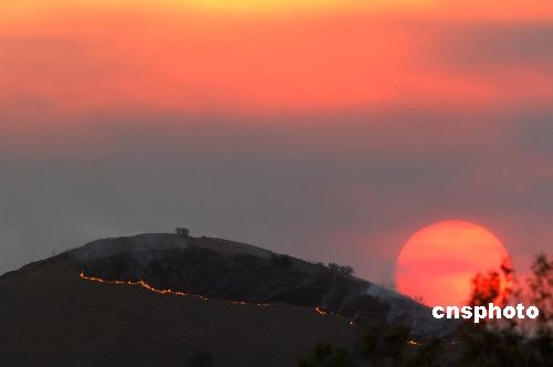圖為太陽下山時科洛娜市的山火仍在蔓延。中新社發(fā) 張煒 攝