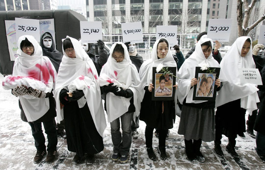 1月16日,韓國一些民眾聚集在首爾以色列使館前進行示威,幾位婦女手舉象征在戰火中喪生的兒童照片和玩偶,抗議以色列襲擊加沙。