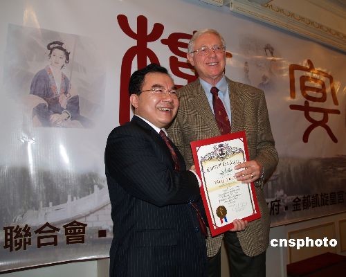 當(dāng)?shù)貢r(shí)間2月19日,“揚(yáng)州紅樓飲食文化節(jié)”在美國(guó)洛杉磯金都凱旋皇宮大酒店開(kāi)幕,這是華夏“紅樓宴”首次登陸北美。洛杉磯縣政委員會(huì)主席安東諾維奇頒賀狀歡迎揚(yáng)州市副市長(zhǎng)王玉新率揚(yáng)州紅樓飲食文化代表團(tuán)訪美。中新社發(fā) 盧威 攝