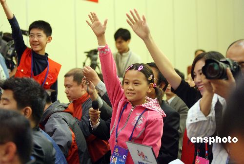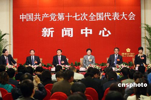 十月二十日晚,出席中共十七大的國家文化部副部長于幼軍、教育部副部長袁貴仁、全國婦聯副主席黃晴宜、共青團中央書記處第一書記胡春華、國家廣播電影電視總局副局長趙實等代表就未成年人教育問題,在北京梅地亞中心接受中外媒體采訪。中新社發 毛建軍 攝