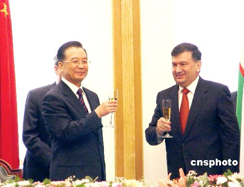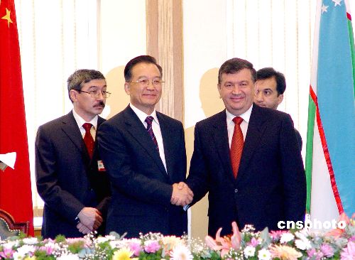 十一月三日,中國(guó)總理溫家寶在塔什干同烏茲別克斯坦總理米爾濟(jì)亞耶夫舉行會(huì)談,會(huì)談結(jié)束后,兩國(guó)總理出席了兩國(guó)政府經(jīng)濟(jì)技術(shù)合作協(xié)定等合作文件的簽字儀式。雙方還發(fā)表了兩國(guó)政府聯(lián)合公報(bào)。中新社發(fā) 孫宇挺 攝