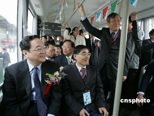 十一月六日,中共中央政治局委員、上海市委書記俞正聲(左)視察“2007中國國際工業博覽會”,并乘坐新能源公共汽車。據悉,這是俞正聲履新上海后,首次出席大型公眾活動。中新社發 潘索菲 攝