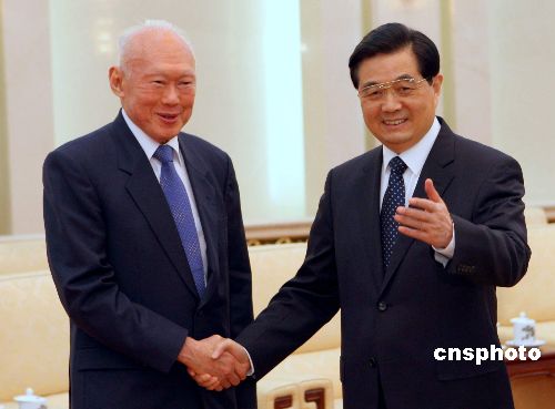 十一月十六日,中國(guó)國(guó)家主席胡錦濤在北京人民大會(huì)堂會(huì)見(jiàn)來(lái)訪(fǎng)的新加坡內(nèi)閣資政李光耀。中新社發(fā) 任海霞 攝