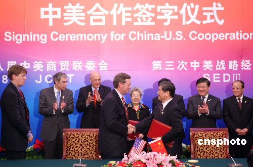 十二月十一日,中美雙方在北京釣魚(yú)臺(tái)國(guó)賓館舉行中美合作簽字儀式,中國(guó)國(guó)務(wù)院副總理吳儀、美國(guó)財(cái)政部長(zhǎng)鮑爾森、商務(wù)部長(zhǎng)古鐵雷斯等出席簽字儀式。中新社發(fā) 毛建軍 攝