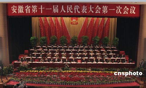 1月25日上午9時,安徽省第十一屆人民代表大會第一次會議在安徽大劇院隆重開幕。此次會議將聽取安徽省政府工作報告、審查計劃報告和預算報告,并表決全國人大代表選舉辦法草案、表決總監票人和監票人名單草案、表決關于確定省十一屆人大委員會組成人員名額的決定草案、表決關于設立安徽省十一屆人大專門委員會的決定草案。中新社發 張婭子 攝
