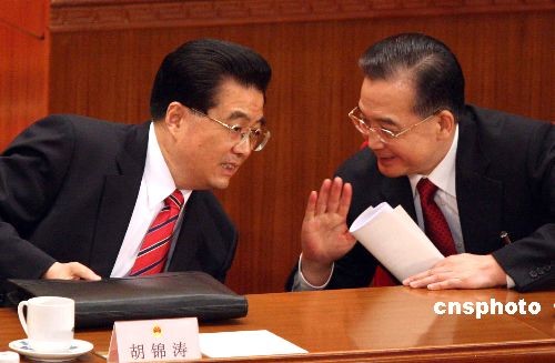 3月5日上午,十一屆全國人大一次會議在北京開幕。溫家寶作政府工作報告后,與胡錦濤進行交談。中新社發 張宇 攝