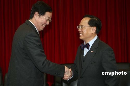 3月18日,香港特別行政區行政長官曾蔭權在北京先后拜訪了中國人民銀行和中國證券監督管理委員會。圖為曾蔭權與中國人民銀行行長周小川握手。中新社發 盛佳鵬 攝