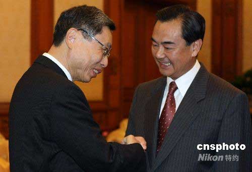 6月12日晚,新任中臺辦、國臺辦主任王毅(右)在北京釣魚臺會見并宴請臺灣海峽交流基金會董事長江丙坤一行。會見時,王毅與;鶗倍麻L高孔廉親切交談。中新社發 任晨鳴 攝
