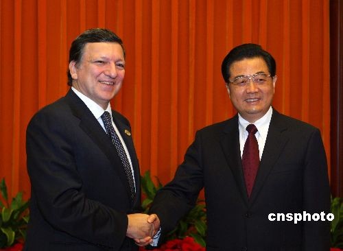 10月23日,中國國家主席胡錦濤在北京人民大會堂會見前來出席第七屆亞歐首腦會議的歐盟委員會主席巴羅佐。中新社發 廖文靜 攝