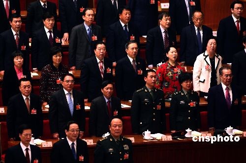 3月5日,第十一屆全國人民代表大會第二次會議在北京人民大會堂開幕。參會代表全體起立,高唱國歌。中新社發 杜洋 攝