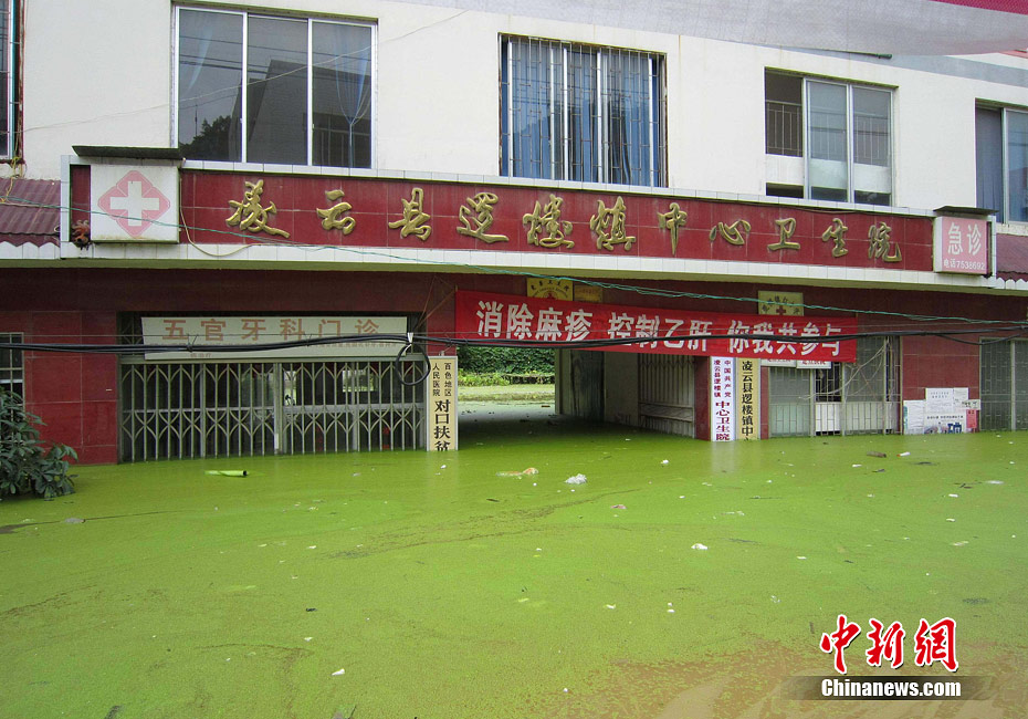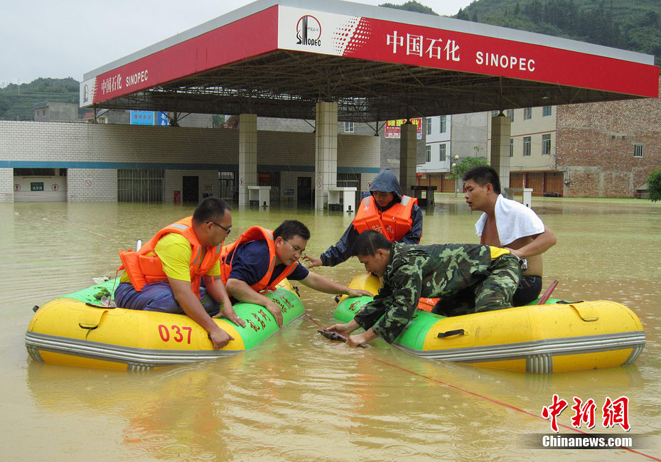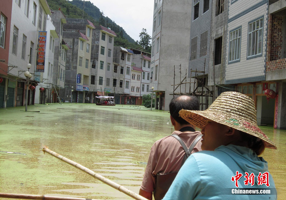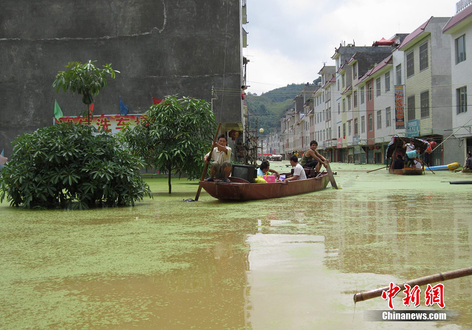 由于遭遇連日暴雨,廣西凌云縣邏樓鎮內澇成災,全鎮一片汪洋,積水深達2米多高,民眾只能用小機船和自制排伐作為交通工具。由于該鎮所在地為一個小盤地,沒有排水的地方,估計一個月后積水才能自然排完。6月27日20時至29日,廣西凌云縣遭遇罕見強降雨襲擊,造成嚴重洪澇災害。初步統計,當地已緊急轉移一萬多人。圖為30日所攝邏樓鎮被淹景象。黃燕飛 攝