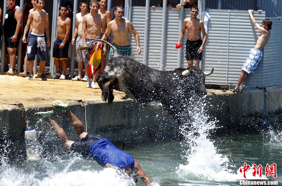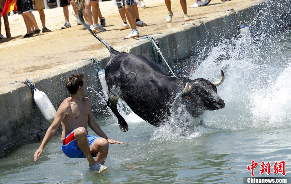 7月5日,西班牙東部德尼那小鎮一年一度的海邊奔牛節再度舉行。這里的奔牛節與眾不同,斗牛士們挑逗著一頭頭暴躁的公牛跳入海中,俗稱“奔牛入海”場面蔚為壯觀。