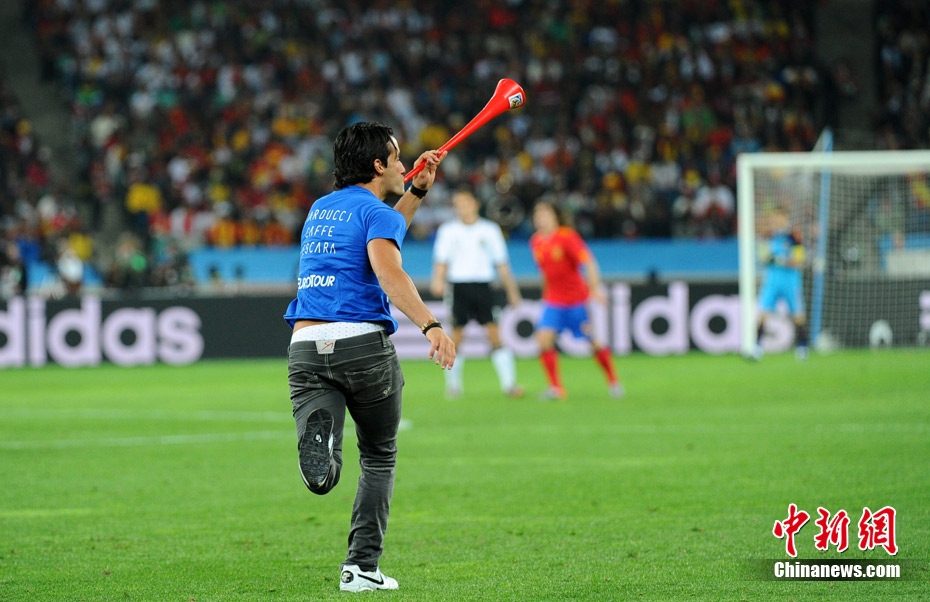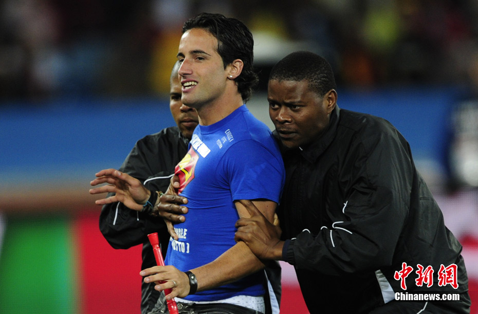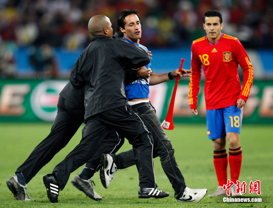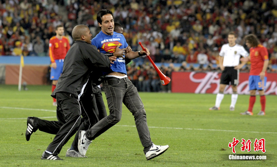 西班牙隊和德國隊激戰正酣時。一名球迷身穿超人背心突然闖進球場,此時雙方的比賽短暫地暫停了一會兒,球迷被保安推出了球場。后經有關部門證實,這是一名意大利球迷。