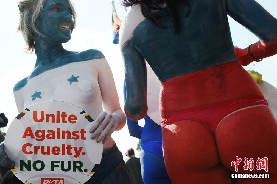 7月8日,南非世界杯賽場(chǎng)外,善待動(dòng)物組織(PETA)舉行彩繪游行。參與者身體上畫各國(guó)的國(guó)旗,并舉著寫有“團(tuán)結(jié)起來(lái) 抗議使用皮草”的標(biāo)語(yǔ)牌。