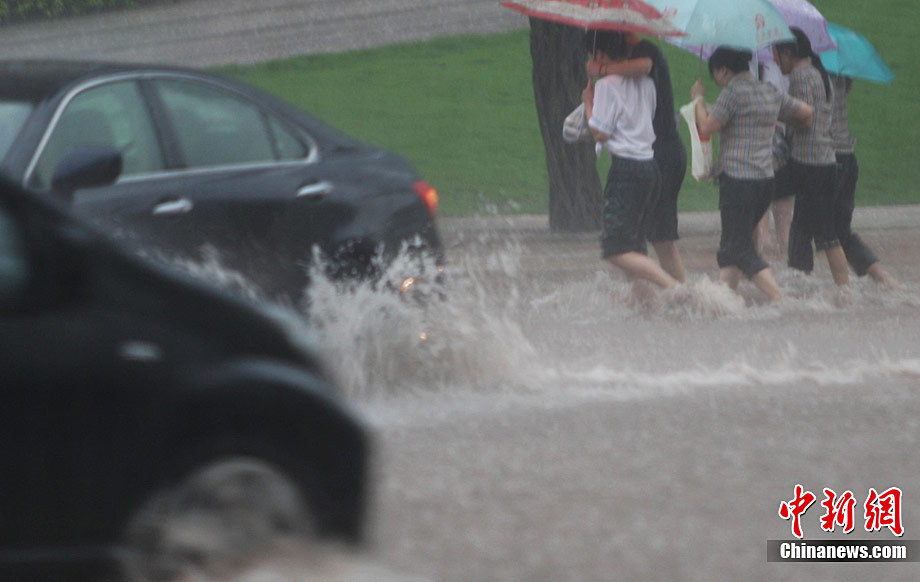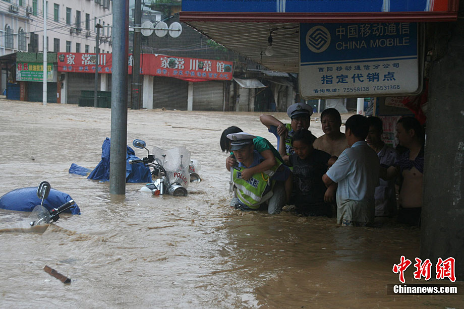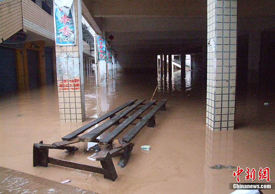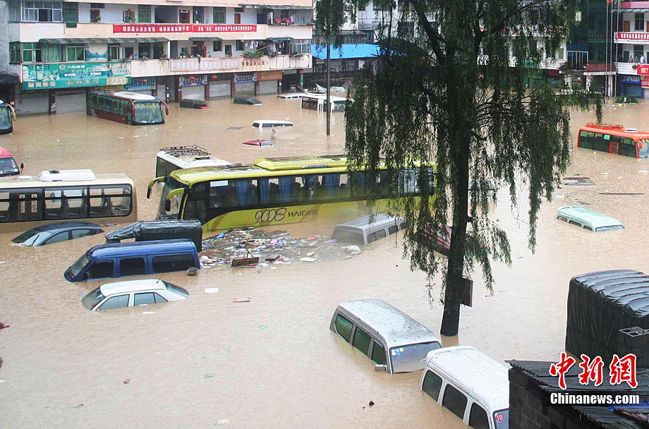 7月9日,重慶酉陽縣城一個停車場被洪水淹沒。8日21時開始,重慶市酉陽縣各地出現今年入汛以來最強降水,導致該縣眾多地勢較低洼地方被淹。截至9日8時,該縣平均降水量達151.4毫米,目前當地降雨仍在持續。中新社發 黃勝華 攝