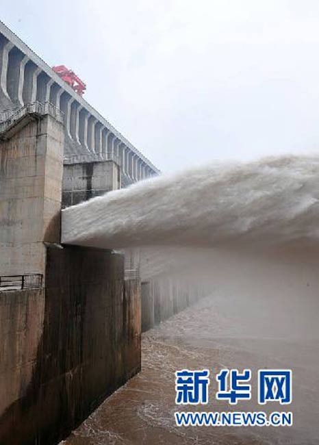 7月19日,三峽大壩開啟6個泄洪深孔和一個排漂孔泄洪。當日上午8時,三峽水庫入庫流量增至58000立方米/秒,再創今年入汛以來新高。長江三峽集團公司目前正按長江防總最新調度令,從19日10時起,再度加大泄洪力度,將出庫流量調高到40000立方米/秒,積極迎戰建庫以來的最大洪峰。據長江水文局最新預報,長江上游正在形成一場大洪水,洪峰流量將逼近70000立方米/秒。 鄭家裕 攝(圖片來源:新華網)