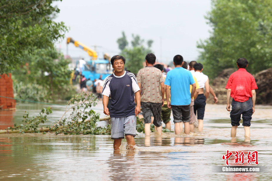 7月21日4時30分左右,遼寧省鐵嶺縣境內勝利河阿吉段決口,決口寬度20米,流量600立方米/秒,淹沒耕地5000畝,當地駐軍、公安干警、民兵預備役400多人投入抗洪搶險,轉移群眾3000多人。此前該地區連降暴雨,平均降雨362毫米。圖為阿吉村民金福祥看著自己家被淹沒非常傷心。中新社發 秦逸 攝