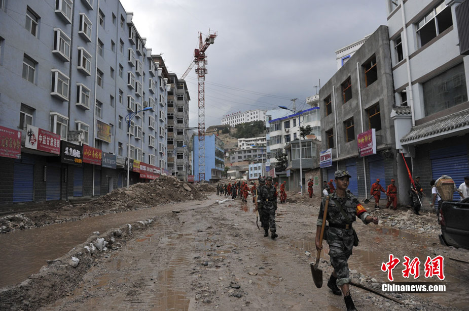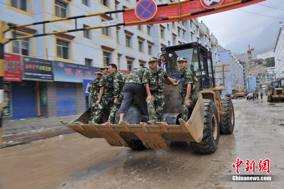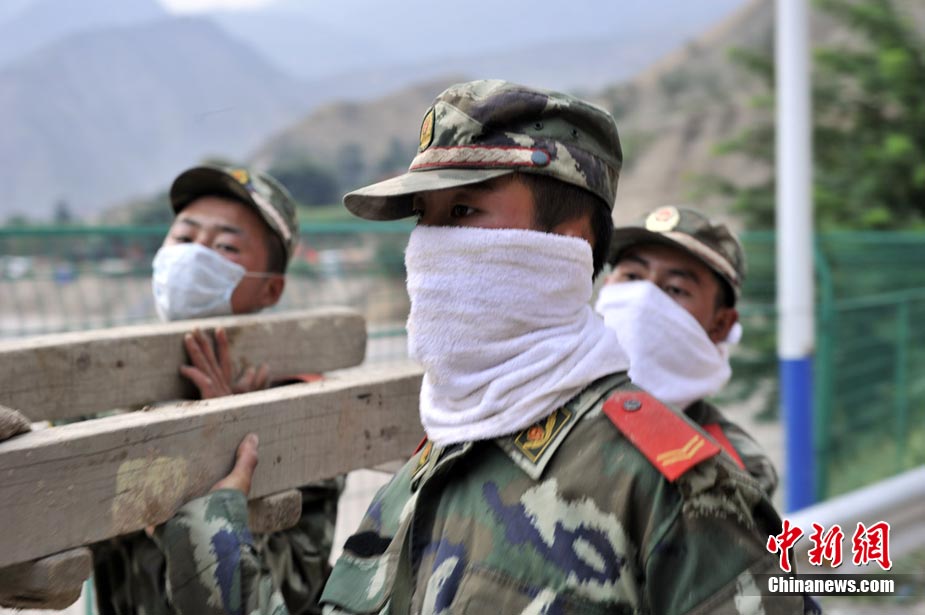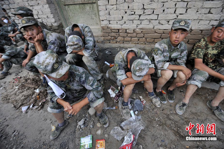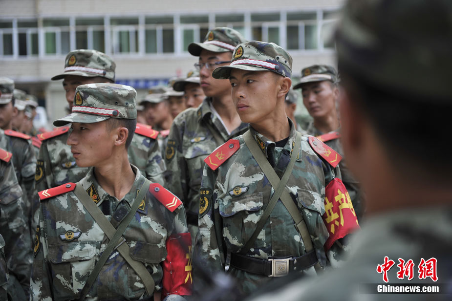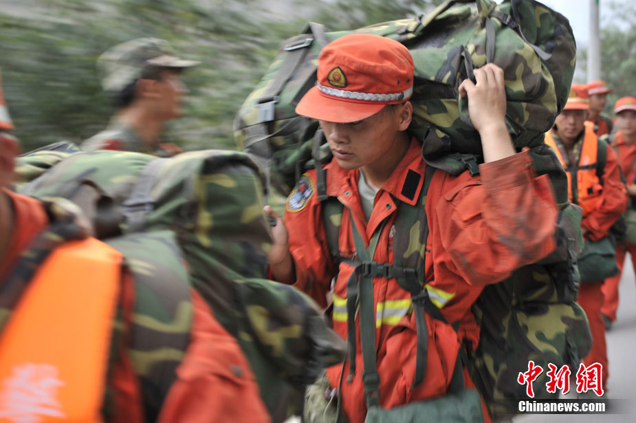 8月10日清晨,甘肅舟曲災區,武警官兵整裝待發。8日凌晨,甘肅省舟曲縣因強降雨引發滑坡泥石流,造成重大人員傷亡,電力、交通、通訊中斷。中新網記者 金碩攝